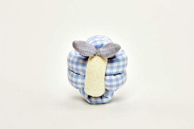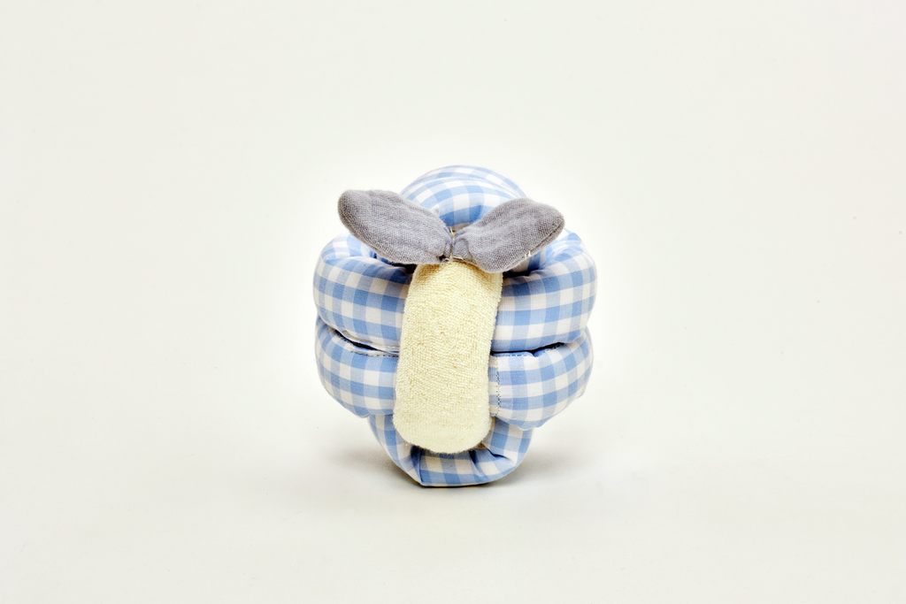 Gefertigt ist der Ball aus ineinander verknoteten Ringen aus weichem Strickfrottee.