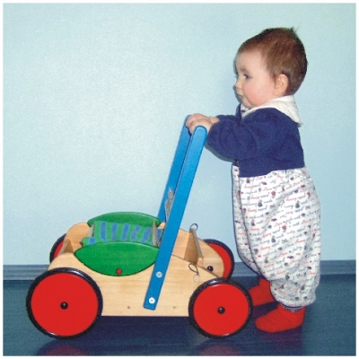 Sehr stabiler Lauflernwagen aus Holz mit gummibereiften Rädern, der Kindern hilft, Laufen zu lernen.