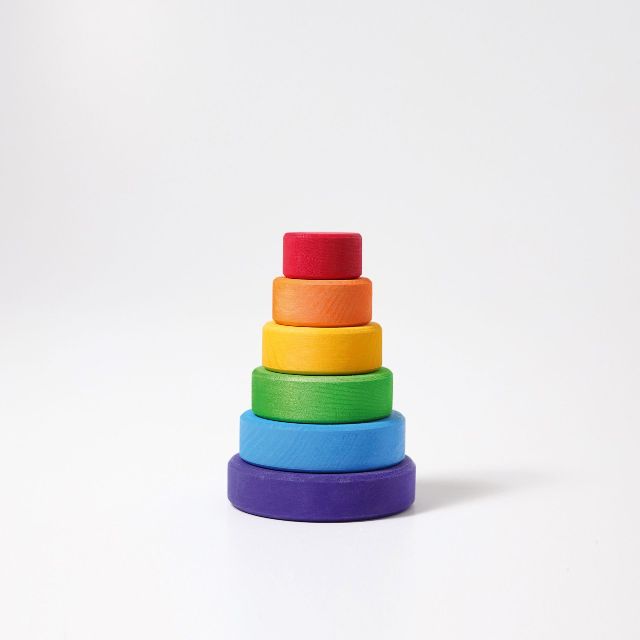 Der kleine Grimms Scheibenturm besteht aus fünf unterschiedlich großen Scheiben zum Stecken und Stapeln.