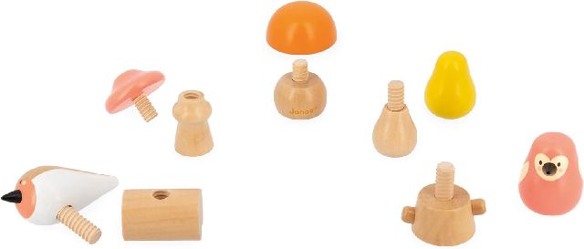 Dieses hübsche Set aus Massivholz und in sanften Farben besteht aus 5 Schraubelementen, die auf kleine Kinderhände abgestimmt sind.
