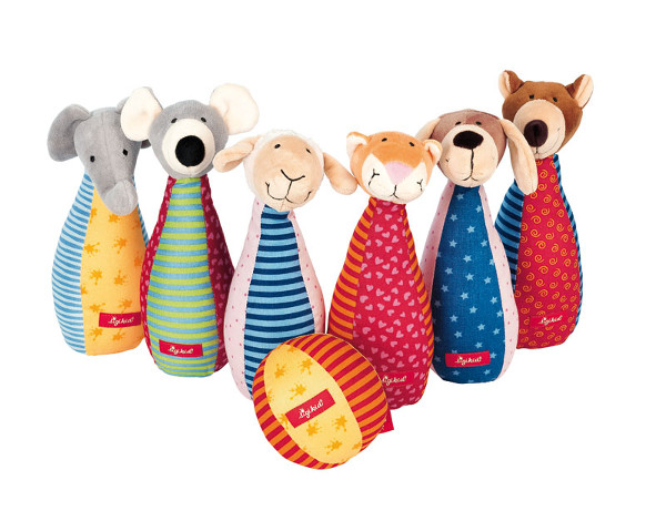 6 Kegel jeweils 21 cm groß, 1 Ball. Mit eingebauter Rassel.