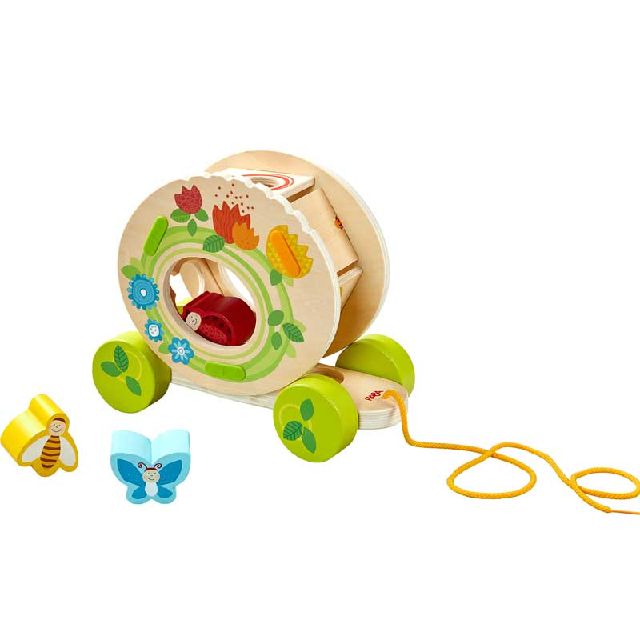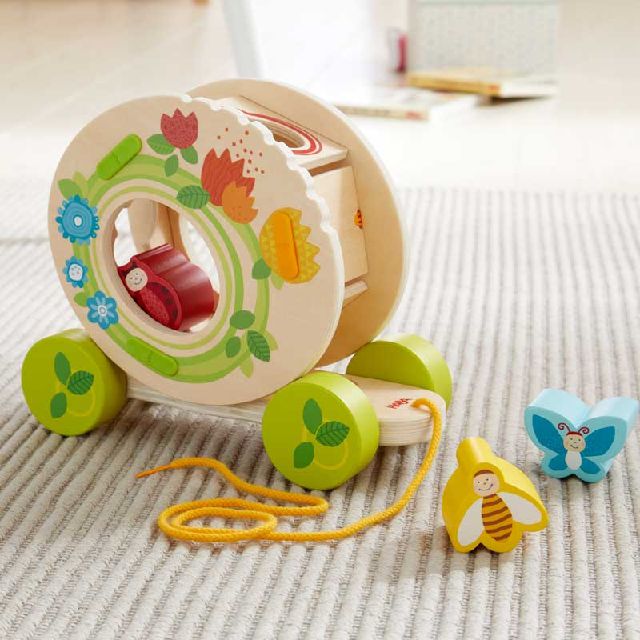 Das Nachziehen der bunten Sortierbox erzeugt ein lustiges Rattern und regt Kleinkinder zum Krabbeln und Laufen an.