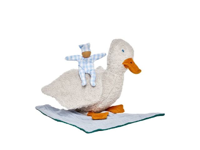 Das kleine Püppchen hält sich an den Flügeln der Ente fest, während das Kind seine Hände unter ihnen vergraben kann