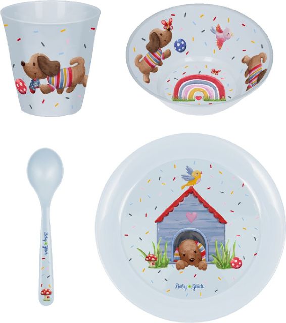 Löffel, Teller, Schale und Becher im trendigen Dackel-Design von BabyGlück.