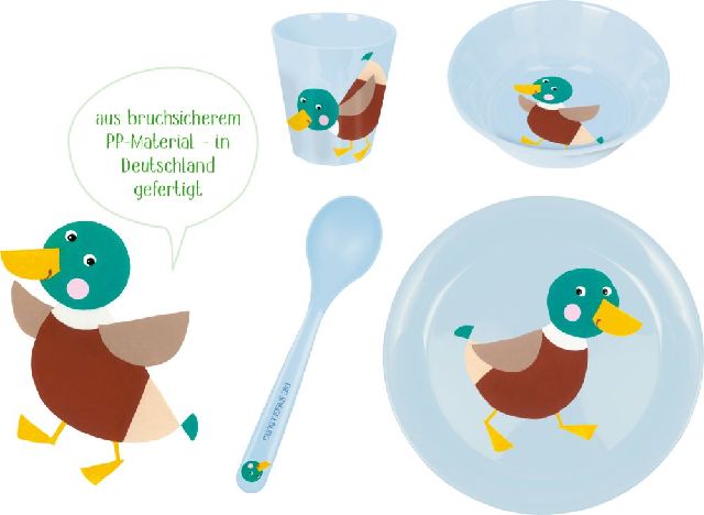 Im Set enthalten: Löffel, Teller, Schale und Becher mit fröhlichem Enten-Motiv von Die Spiegelburg.