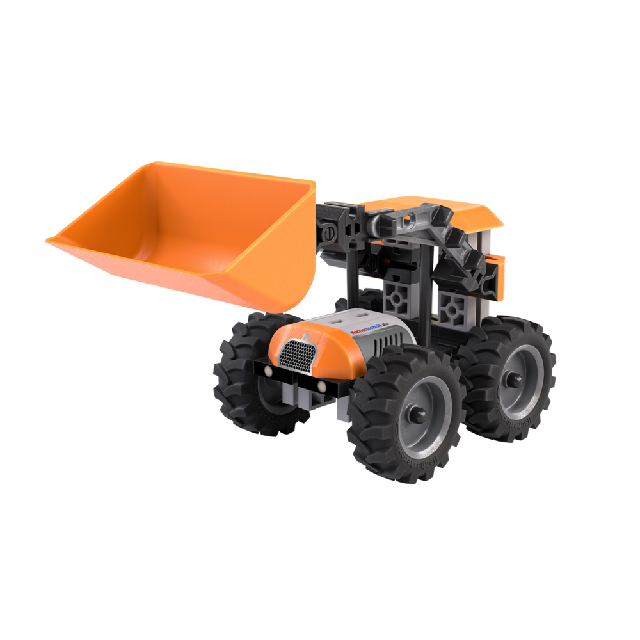 >>>>Der Fischertechnik Radlader nimmt mit seinem kippbaren Frontlader mühelos Baumaterialien auf und transportiert sie weiter