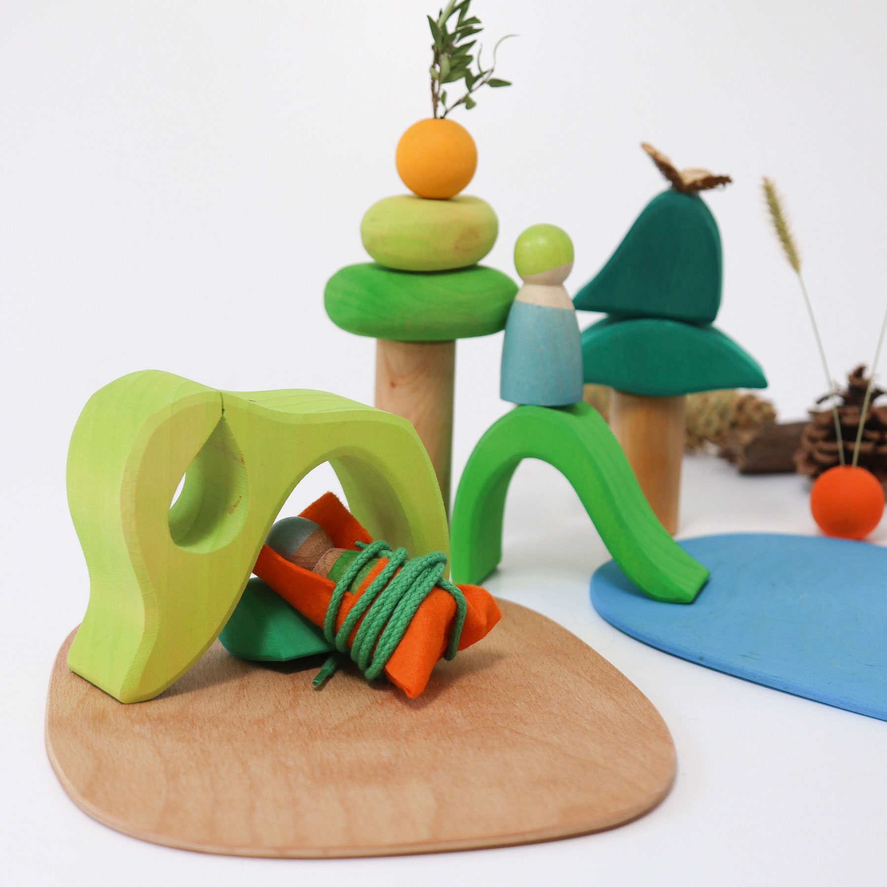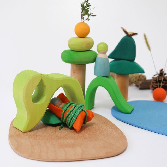 Besonderes Kennzeichen der Spielwelt Waldlichtung sind die zwei unterschiedlich großen Kiesel, die Walzen in zwei Größen und das Häuschen mit extra Bohrungen zum Schmücken.
