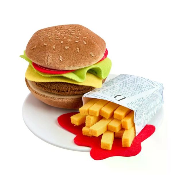 Das Set enthält eine bunte Auswahl an Zutaten aus hochwertigem Holz und weichem Stoff, die es den Kindern ermöglichen, leckere Gerichte wie Burger mit Pommes, Wraps, Ramen oder Köttbullar mit frischem Gemüse und Kartoffeln zuzubereiten.