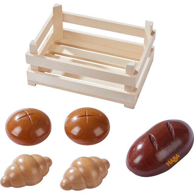 Das HABA Spielset für Kaufladen und Kinderküche enthält viele lebensnah gestaltete Spielzeug-Lebensmittel: Brot, Brötchen und Croissants aus Holz lassen sich in der hochwertigen Stiege schön präsentieren und transportieren.