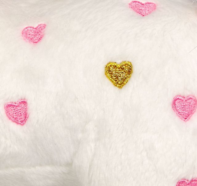 Mit schimmerndem Horn, glänzenden Hufen und kuschelweichem Fell in Weiß mit rosafarbenen Herzen ist es ein besonders niedlicher Plüschgefährte.
