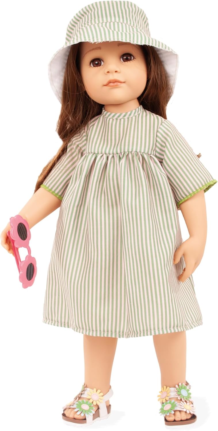 Hannah Summertime begeistert mit ausdrucksstarken braunen Augen, langen Haaren und einem stilvollen Sommerlook. Ihr grün gestreiftes Kleid, kombiniert mit passendem Hut, Blumen-Sonnenbrille und extravaganten Sandalen, zeugt von Liebe zum Detail. Diese hochwertige Stehpuppe verbindet anspruchsvolles Design mit exzellenter Verarbeitung – ein besonderes Stück für alle, die Wert auf Qualität und Ästhetik legen.
