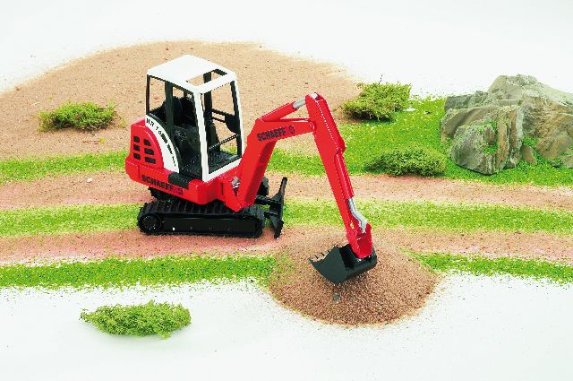 Der Ausleger des Schaeff Minibaggers kann seitlich abgewinkelt werden, dabei wird eine realistische Baggerfunktion möglich.
