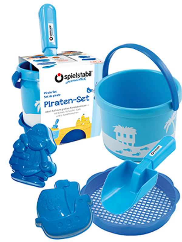 Sandset bestehend aus Pirateneimer, Sieb, Schaufel und 2 neuen Förmchen Motiv Pirat und Totenkopf als tolle Ergänzung zum Burgthema.