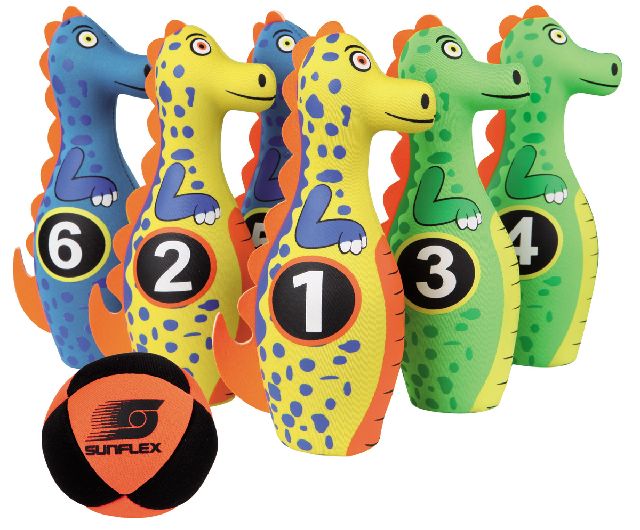 Mit dem bunten sunflex KEGELSET DINO, bestehend aus verschiedenfarbigten Pins und einem Ball, können die Jüngsten schon für spätere Kegel-Abende üben.