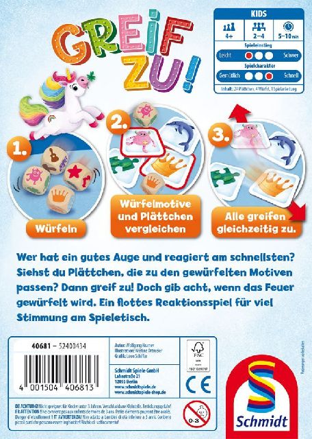 „Greif zu!“ entwickelt sich schnell zu einem herrlich lebhaften Wettstreit, bei dem es nicht nur auf schnelle Hände, sondern auch auf wache Augen ankommt. Perfekt geeignet für eine kurze Runde zwischendurch oder turbulente Spielenachmittage mit der ganzen Familie.