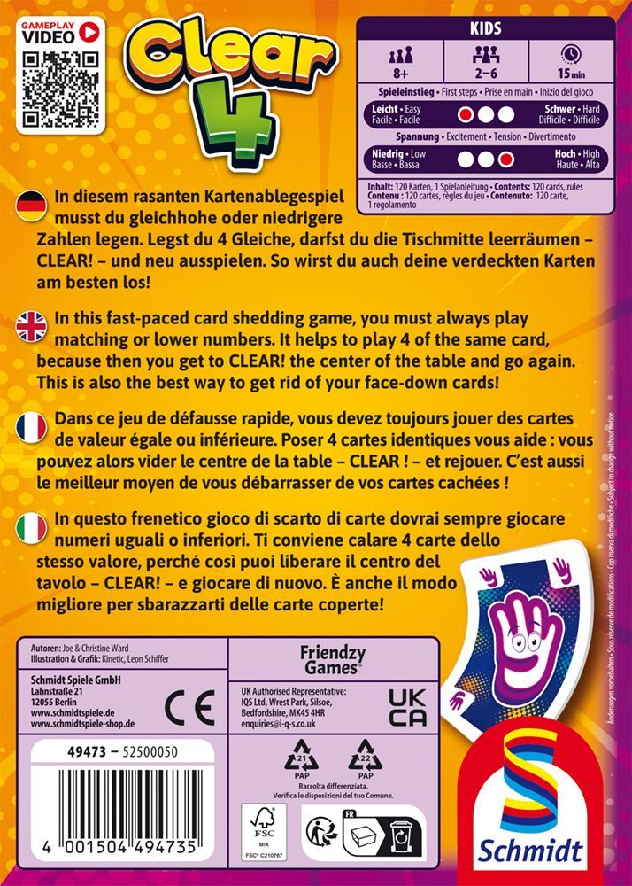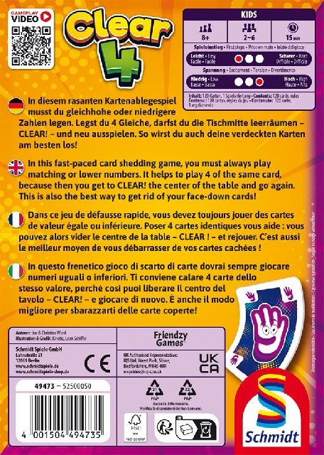 „Clear 4“ ist ideal für alle, die es direkt, dynamisch und mit ein bisschen Nervenkitzel mögen. Schnell gelernt, sofort losgespielt und kaum wieder wegzulegen. Spielziel